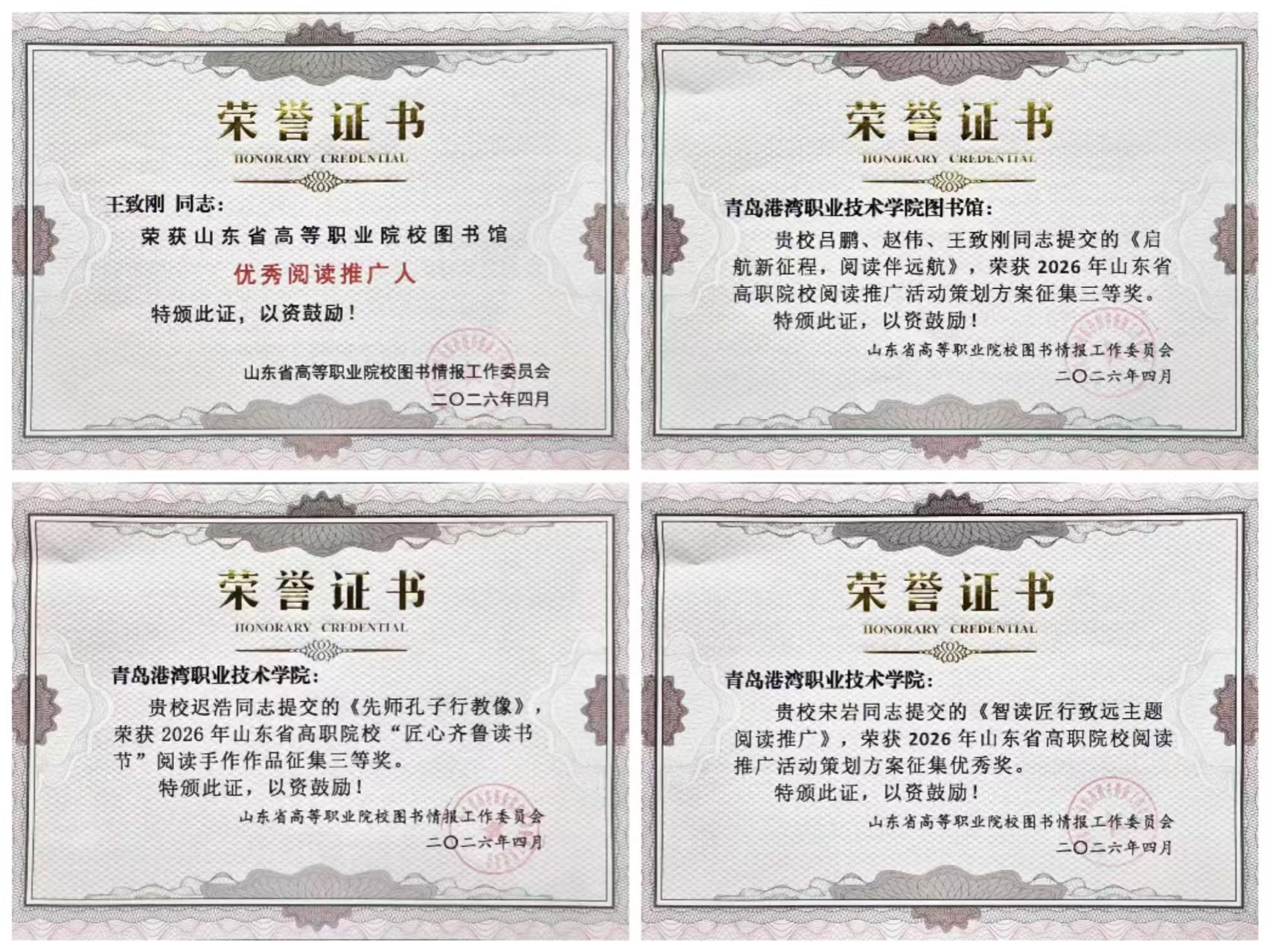 会议期间公布了多项评选结果。我馆王致刚荣获“山东省高职院校图书馆优秀阅读推广人”称号;我馆提交的阅读推广活动策划方案《启航新征程,阅读伴远航》荣获三等奖,24电商一班宋岩提交的《智读 匠行 致远》主题阅读推广方案荣获优秀奖。此外,由纸艺协会迟浩创作的手工作品《先师孔子行教像》在“匠心齐鲁读书节”阅读手作作品评选中荣获三等奖。