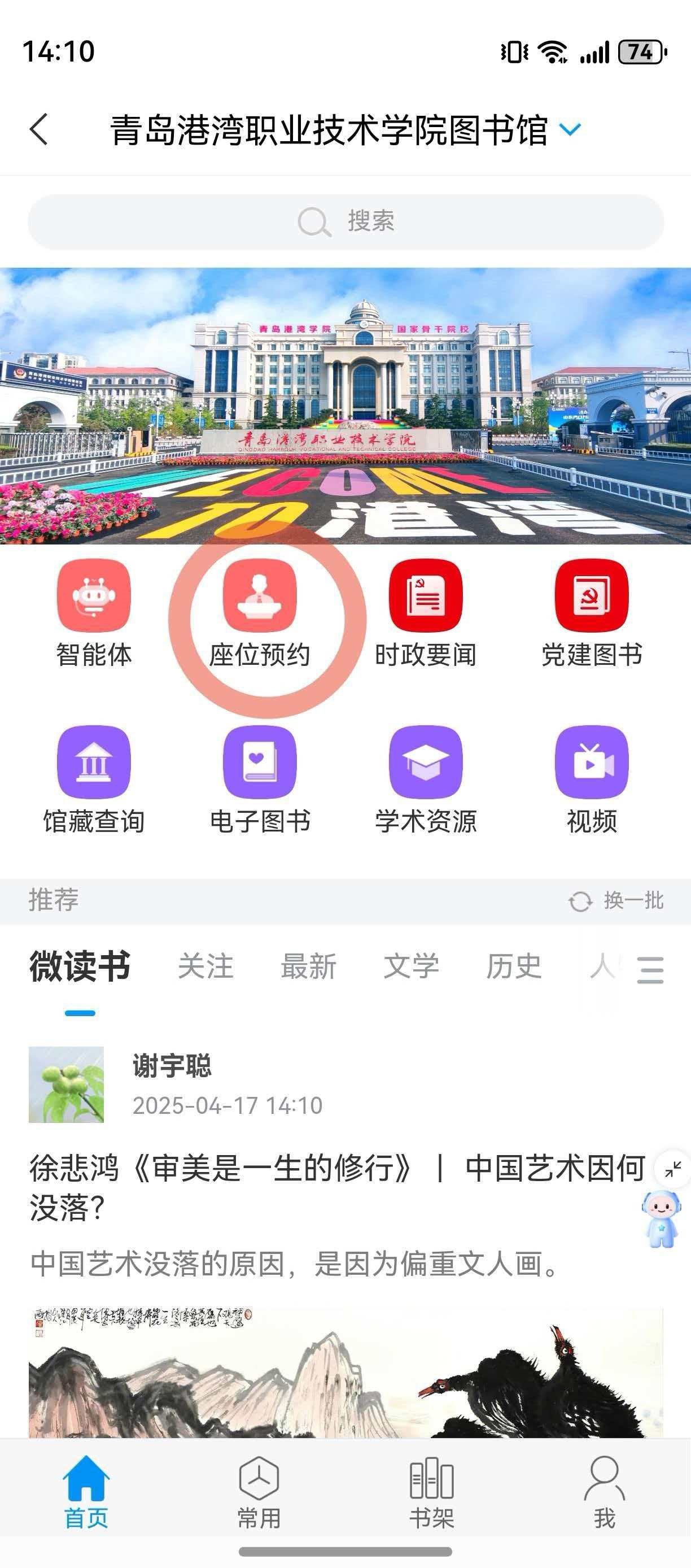 1.打开学习通或移动图书馆app,进入青岛港湾职业技术学院图书馆首页,点击座位预约图标即可使用。