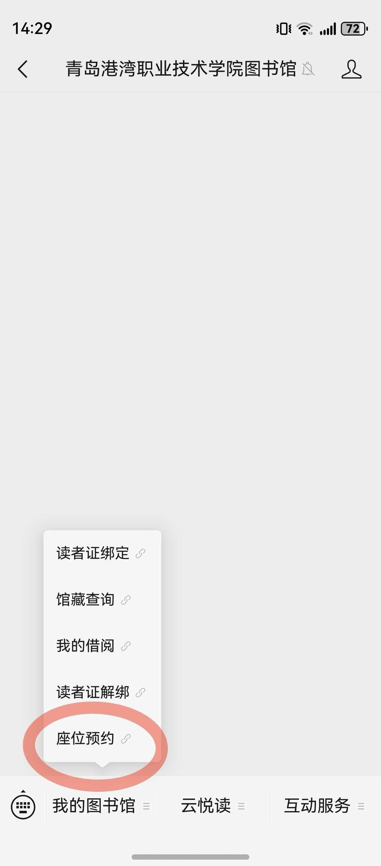 2.打开青岛港湾职业技术学院图书馆微信公众号,在左下角“我的图书馆”板块选择座位预约选项,登陆学习通账号后即可使用